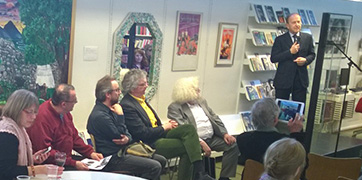 Borgmester Hans Toft på talerstolen. Med det genkendelige store lyse hår ses redaktør Jacob Ludvigsen, til venstre for ham, ses forelæggeren Asger Schnack og derefter forfatteren Lars Movin. Peter Strøm sidder med ryggen til og fotograferer.